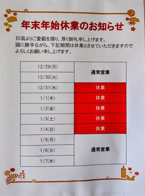 【休業期間】 12月31日(水)~1月4日(日)